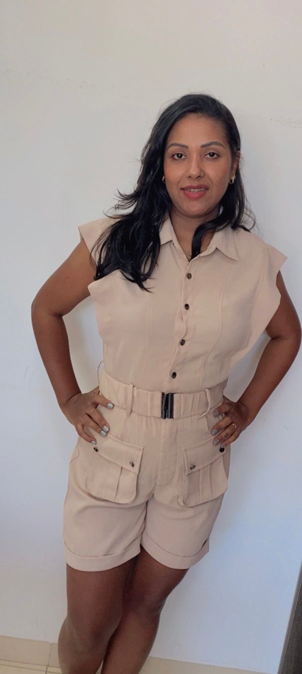O macaquinho é feito em tecido leve, spandex, que não amassa facilmente, garantindo praticidade na manutenção. Sua modelagem valoriza a silhueta sem abrir mão da liberdade para movimentos diários. A peça traz botões frontais e cinto que ajusta a cintura, promovendo um ajuste confortável e sofisticado.